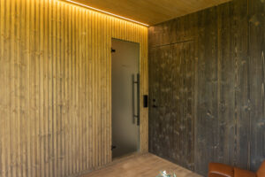 The saunas are made from eco-friendly CLT wood material, which is extremely durable, has excellent thermal insulation, and a high level of fire resistance.