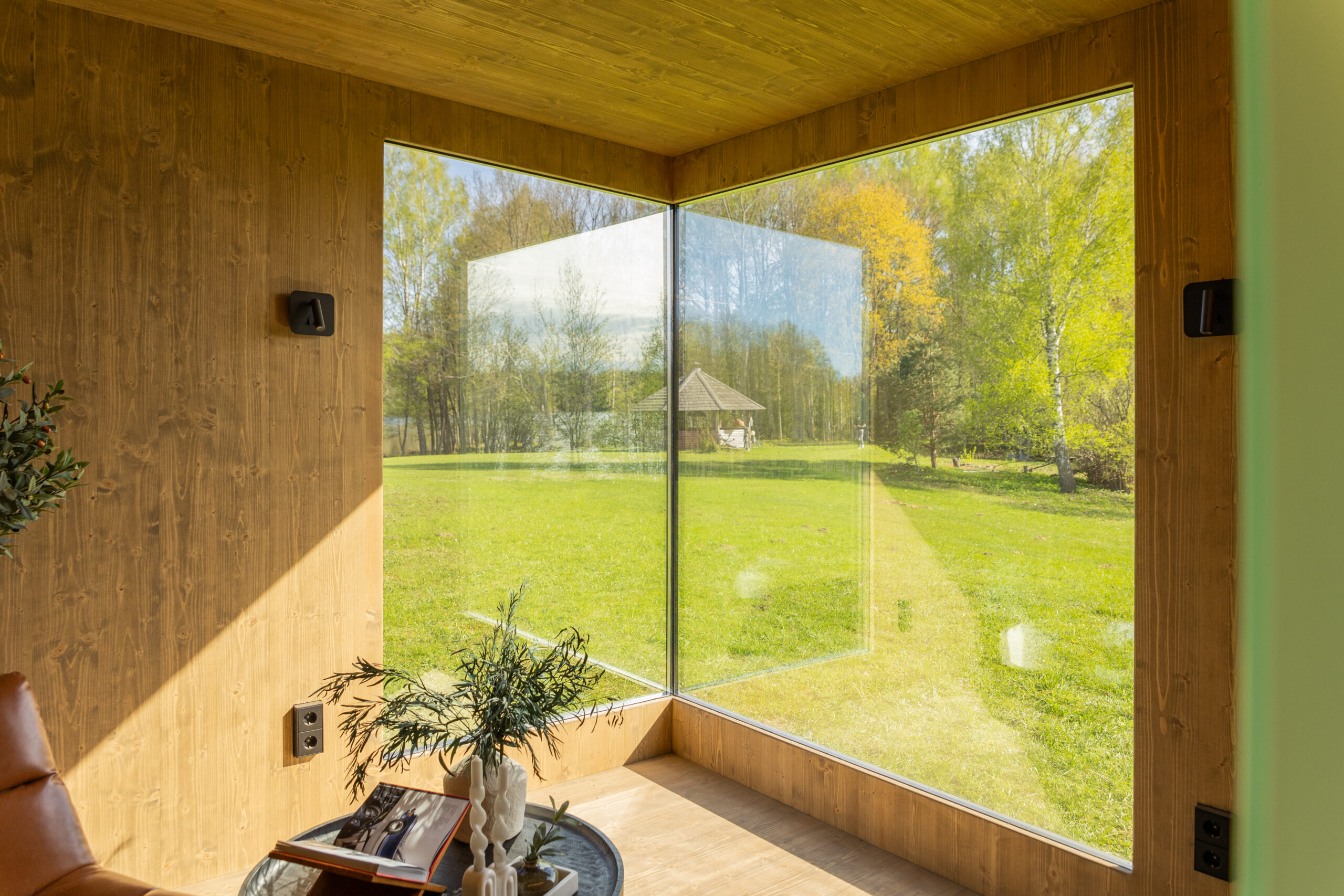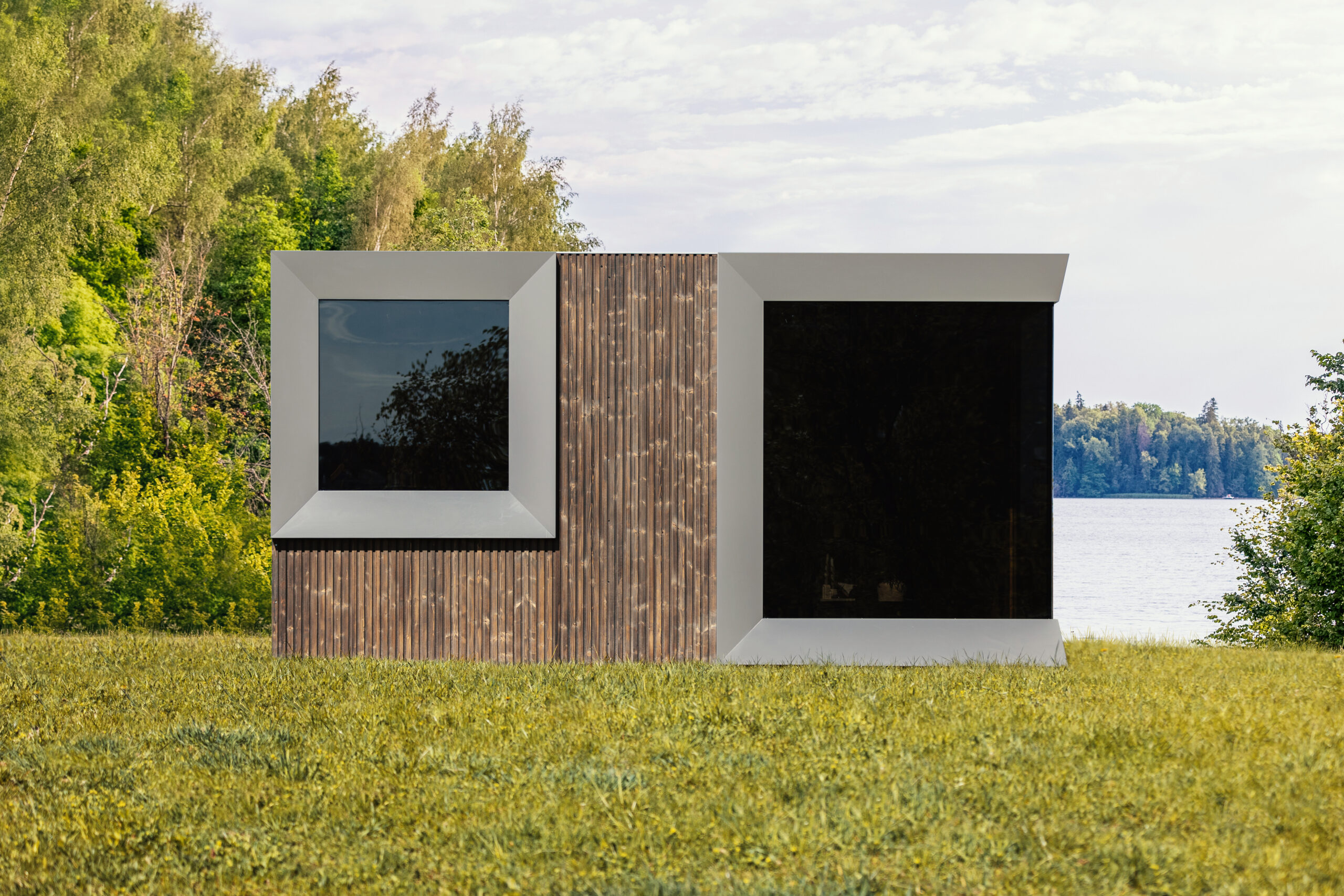 Our new fully functional modular sauna with two large floor-to-ceiling windows and a shower room.