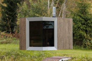 Our new fully functional modular sauna with two large floor-to-ceiling windows and a shower room.
