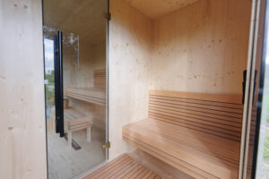 The saunas are made from eco-friendly CLT wood material, which is extremely durable, has excellent thermal insulation, and a high level of fire resistance.