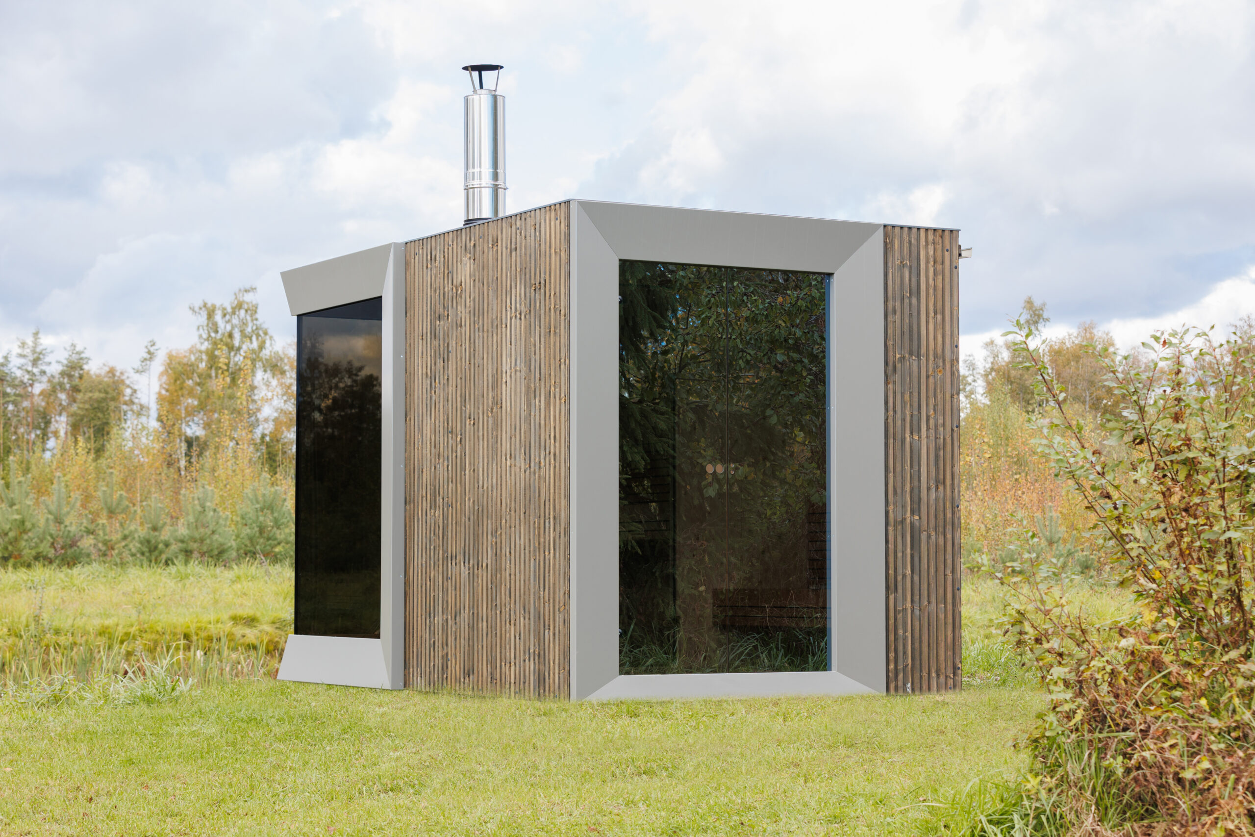 Our new fully functional modular sauna with two large floor-to-ceiling windows and a shower room.